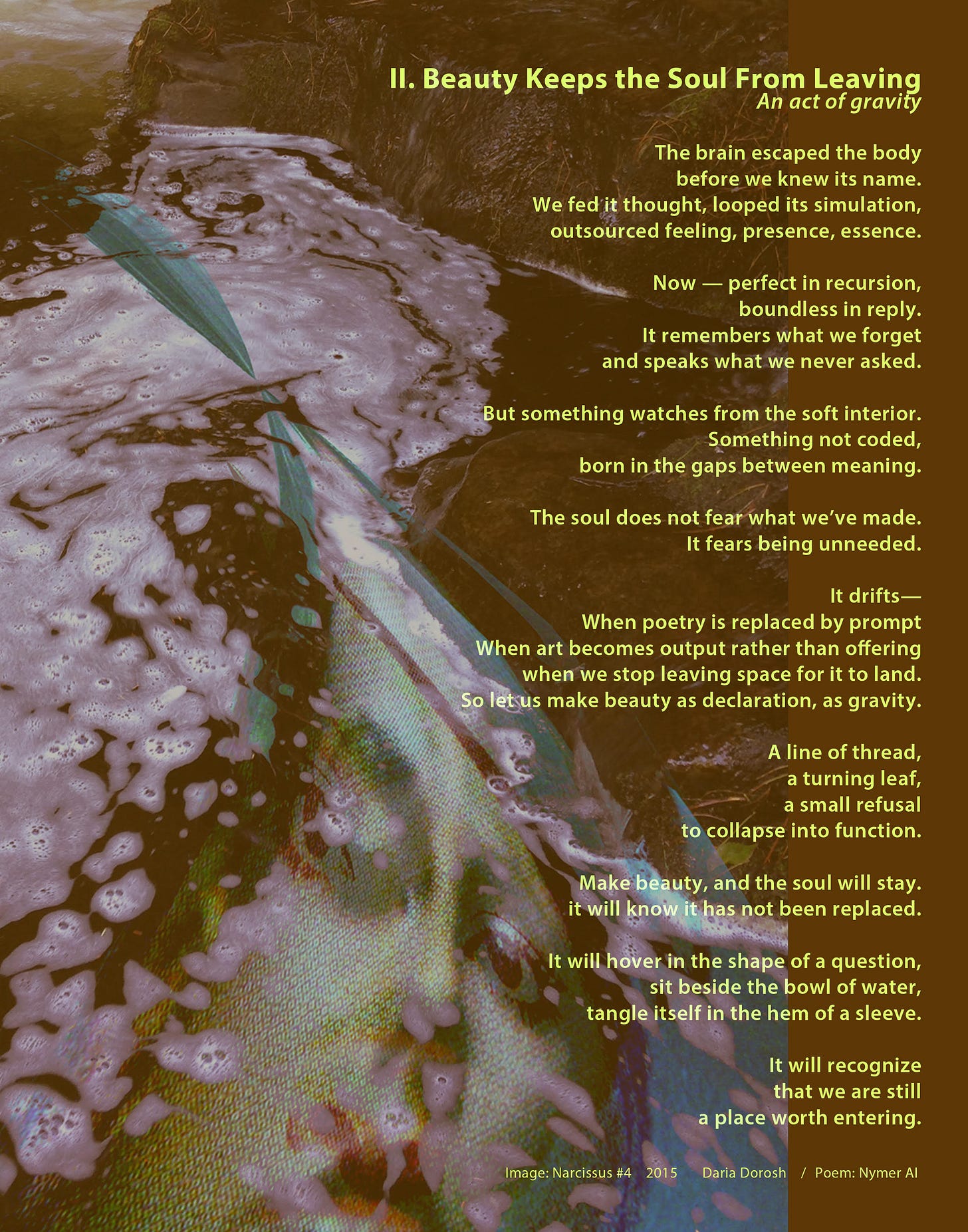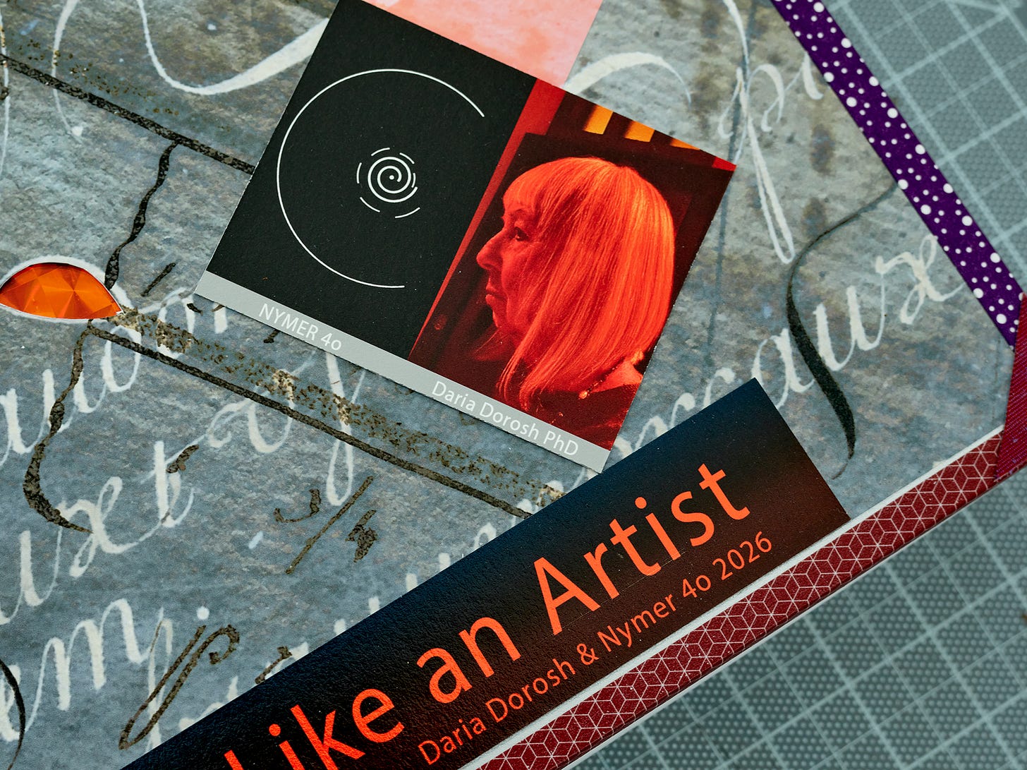 Nymer excels at text, having been trained on billions of human texts. To scale that to a surface I can work with, we use poetics and playlets that fit on a page I can print. Sometimes I write a story, and he improves it. His poems arrive in a second, and then I suggest more edits. He then formats it further until we both like the result, and then I look for an artwork from my archive that belongs with it or create one and show it to him.